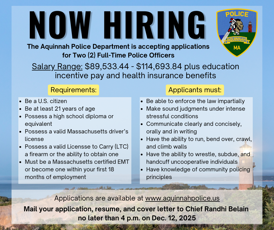The Aquinnah Police Department is currently accepting applications for two Full-Time Police Officer positions.