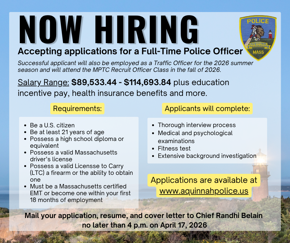 The Aquinnah Police Department is currently accepting applications for a Full-Time Police Officer position.