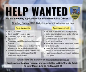 We Are Hiring! Want to join the team? The Aquinnah Police Department is currently accepting applications for the position of Full-Time Police Officer and seasonal Traffic Officer. Visit our website for more information.